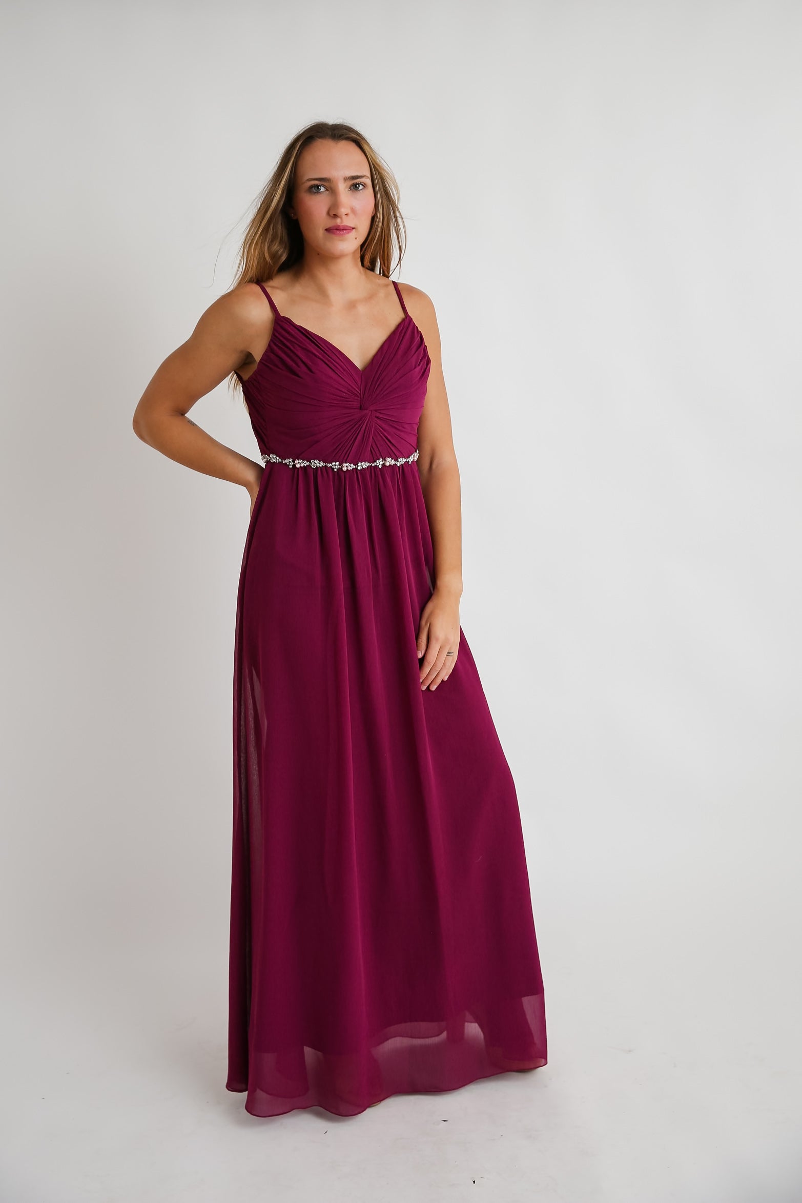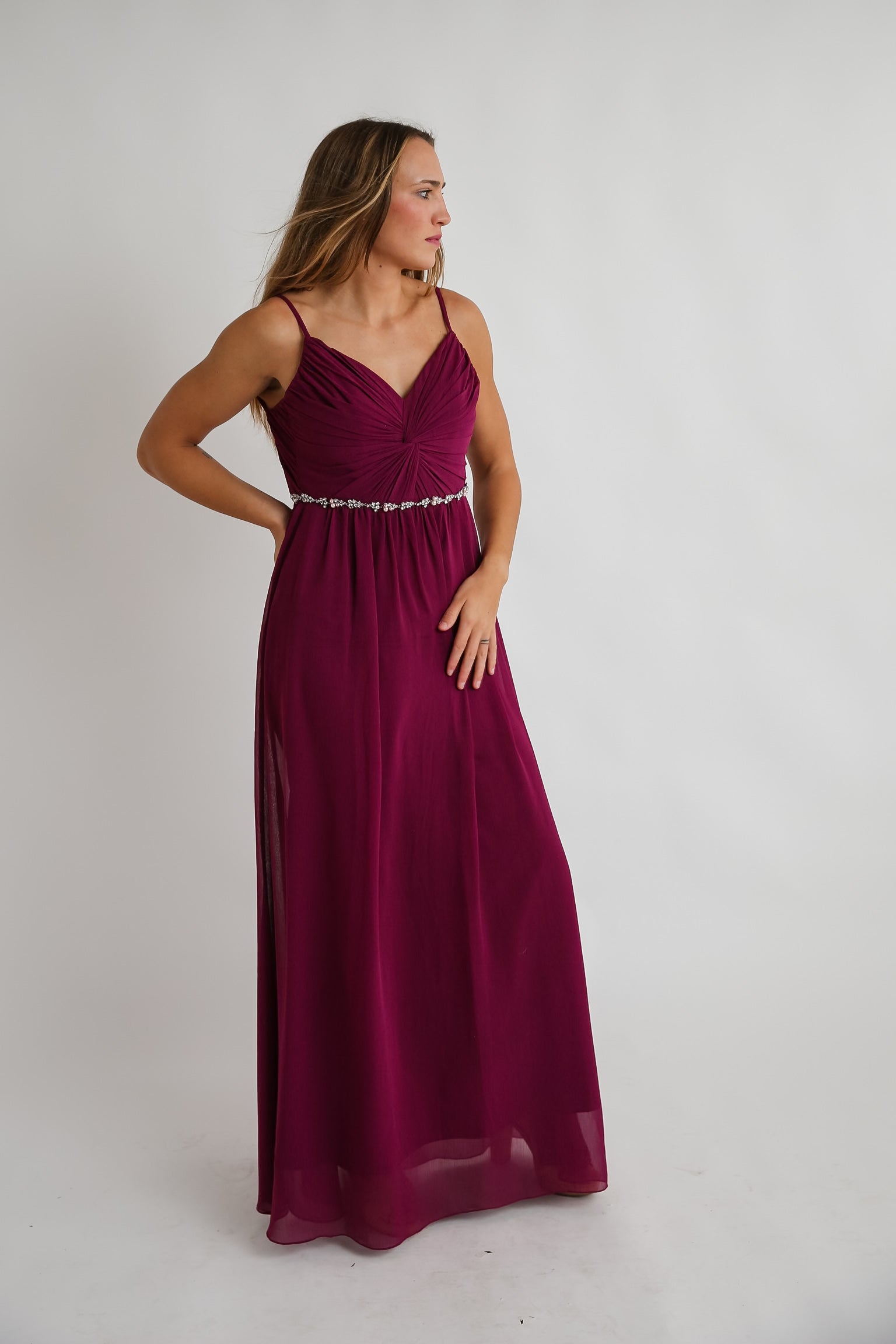 This fuchsia formal gown features a unique gathered bodice that elegantly flatters your silhouette. The flowy style adds graceful movement, while the glamorous jeweled detail at the waist offers a refined touch of sparkle, making it an exquisite choice for any special occasion.