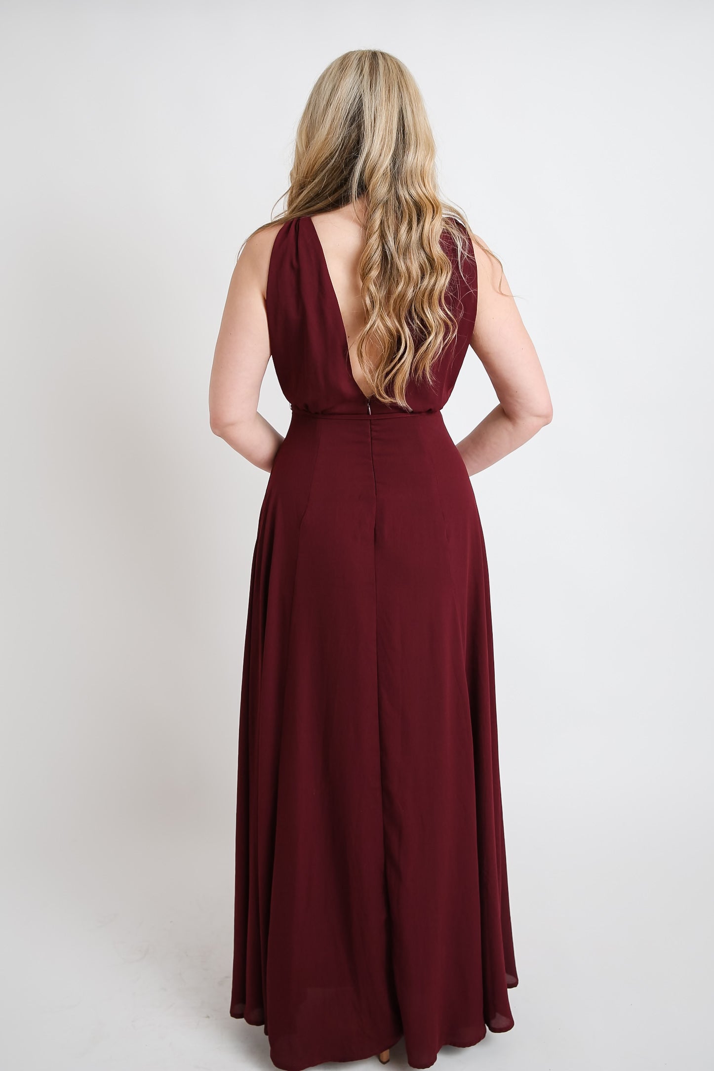 Indulge in luxury and sophistication with our Burgundy flowy gown. Crafted with delicate layered chiffon, this stunning gown features a v-neck design and a tie around the waist for a flattering silhouette.