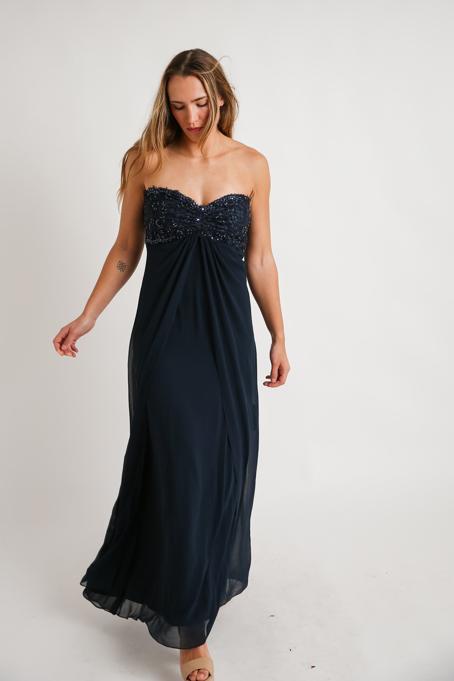 This timeless navy gown features a strapless, flowy silhouette that exudes effortless elegance. The jeweled bodice adds a refined touch of sparkle, perfect for formal occasions. Designed to flatter and flow gracefully, this dress offers both sophistication and comfort for an unforgettable look.